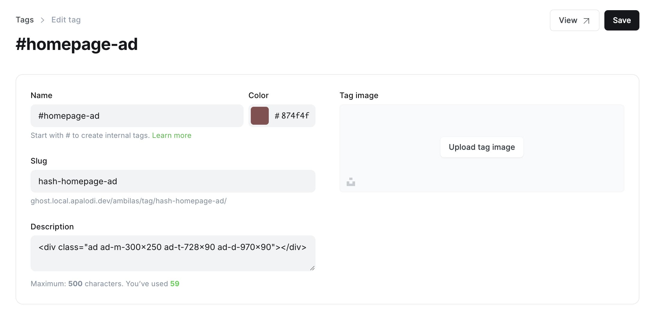 Theme provides 2 AD slots for placing advertisements on your site with the help of internal tags. You create internal tags for #homepage-ad and #post-ad and inside description insert the ad code. See more https://ghost.org/help/tags/