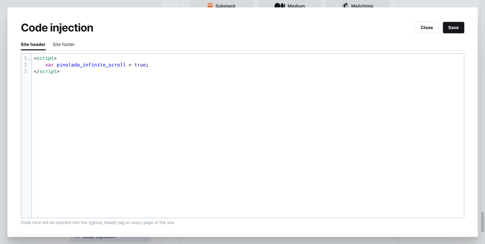 To enable infinite scroll you need to go to Settings > Code injection and enter custom script setting that will enable it.