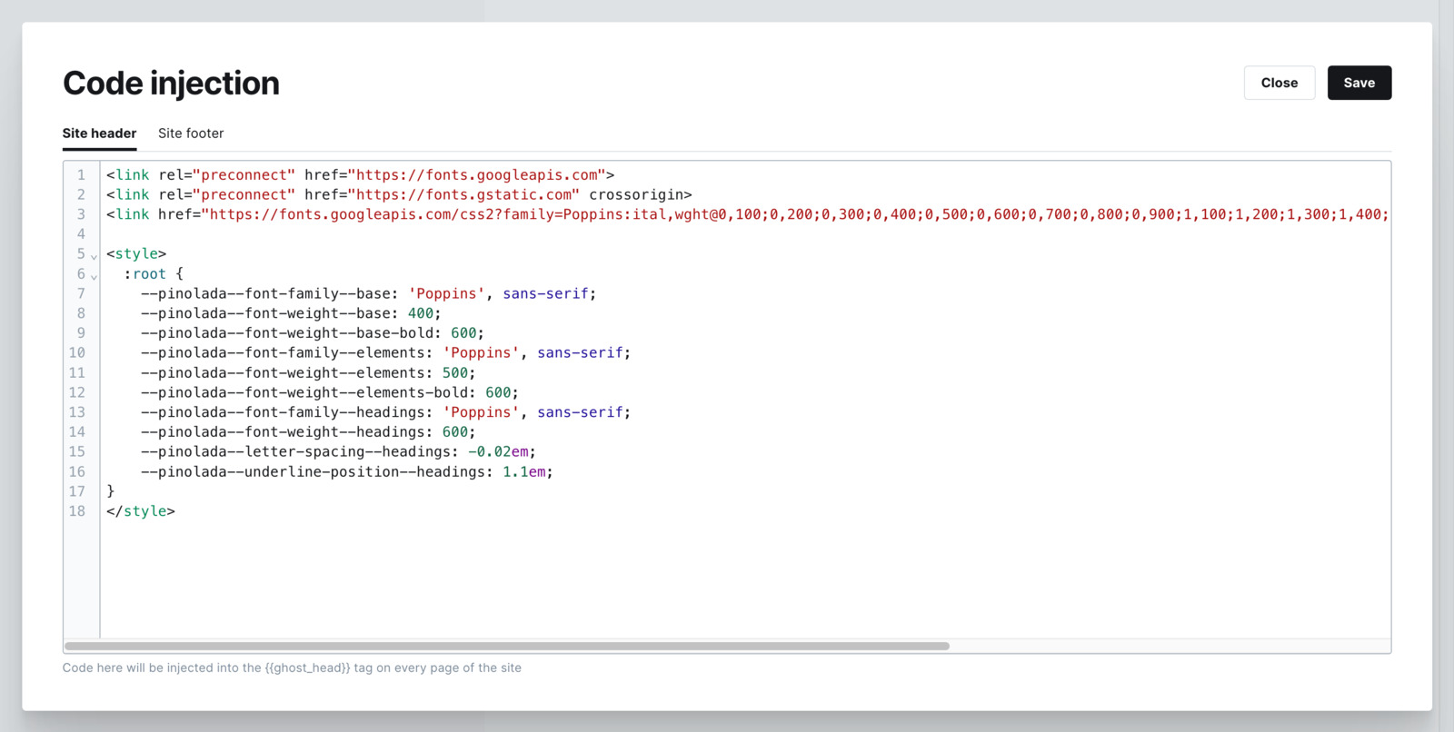 {sitetitle}- Your site title{year}- Current year{ghostlink}- Link to ghost homepage
